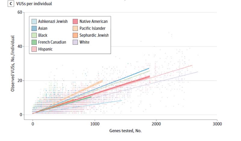 · 人群差异:在原始VUS率方面,亚洲人和塞法迪犹太人(Sephardic Jewish)的VUS率最高,而阿什肯纳兹犹太人(Ashkenazi Jewish)和法裔加拿大人的VUS率最低,白人介于两者之间;而当考虑每个个体测试的基因数量时(即计算标准化VUS率后),太平洋岛民(Pacific Islander)的VUS率最高,其次是其他群体。阿什肯纳兹犹太人的标准化VUS率最低。白人的标准化VUS率低于大多数群体,但高于阿什肯纳兹犹太人和西班牙裔(Hispanic individuals)。不同人群VUS率的差异表明遗传多样性在VUS的发生中起重要作用。